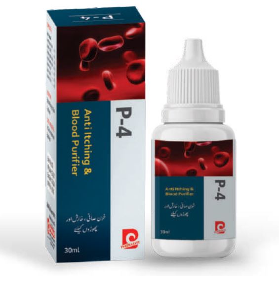 پی-4 شربت ایک قدرتی دوا ہے جو خارش کو دور کرنے اور خون کی صفائی کے لیے تیار کی گئی ہے۔ یہ جلد کی جلن اور الرجی کو کم کرتا ہے اور خون کو صاف کرکے جسم کو صحت مند بناتا ہے۔ باقاعدہ استعمال سے جلد صحت مند رہتی ہے، قوتِ مدافعت بڑھتی ہے اور جسم کا قدرتی صفایا بہتر ہوتا ہے۔