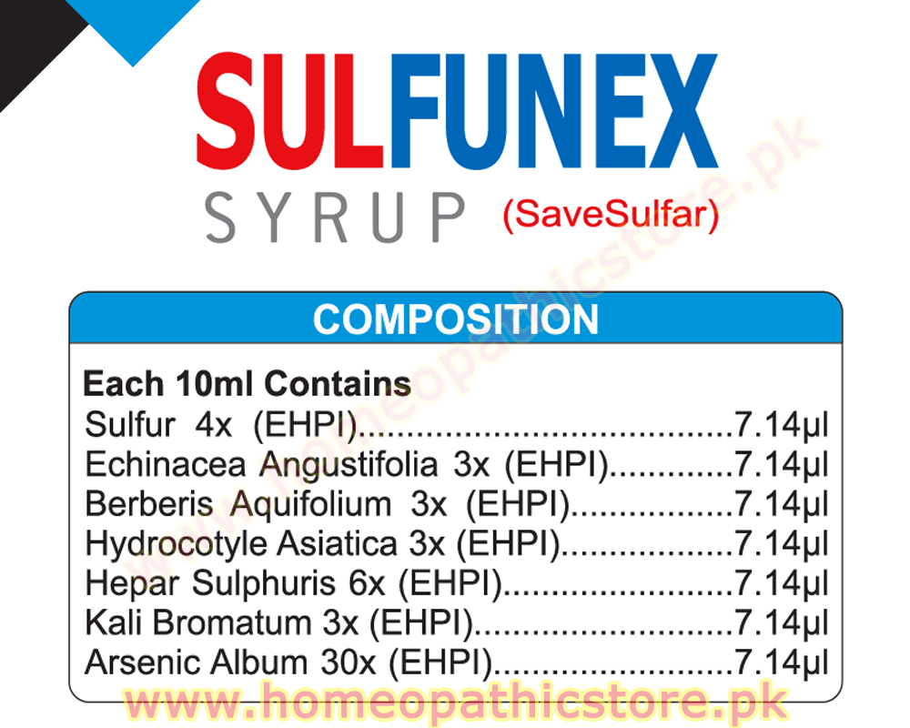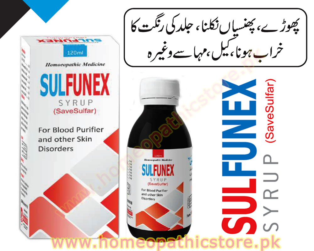 SulFunex Syrup (SaveSulfar) is a skin-supportive formula designed to help with boils, pimples, acne, and uneven skin tone. It works from within the body to purify the blood, reduce skin impurities, and promote a clearer, healthier complexion. Regular use may help in controlling frequent skin eruptions and improving overall skin health. Use only as advised by a physician.